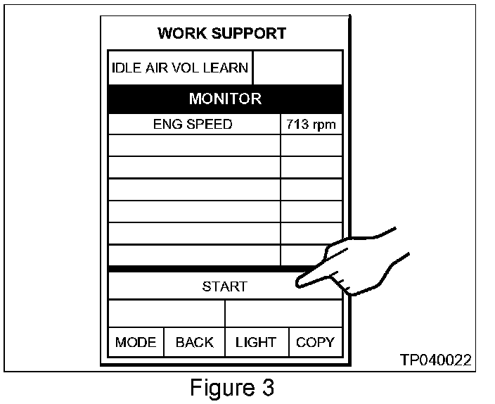 10. Press [START] on the "WORK SUPPORT" screen to begin the Idle Air Volume Learning (IAVL) procedure. See Figure 3.