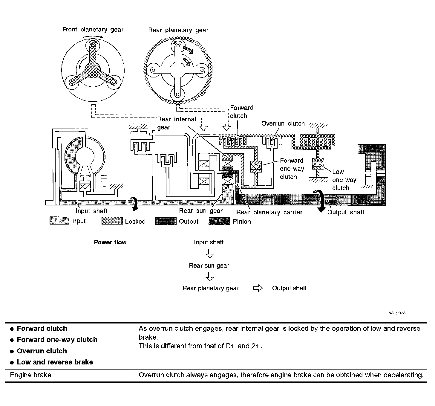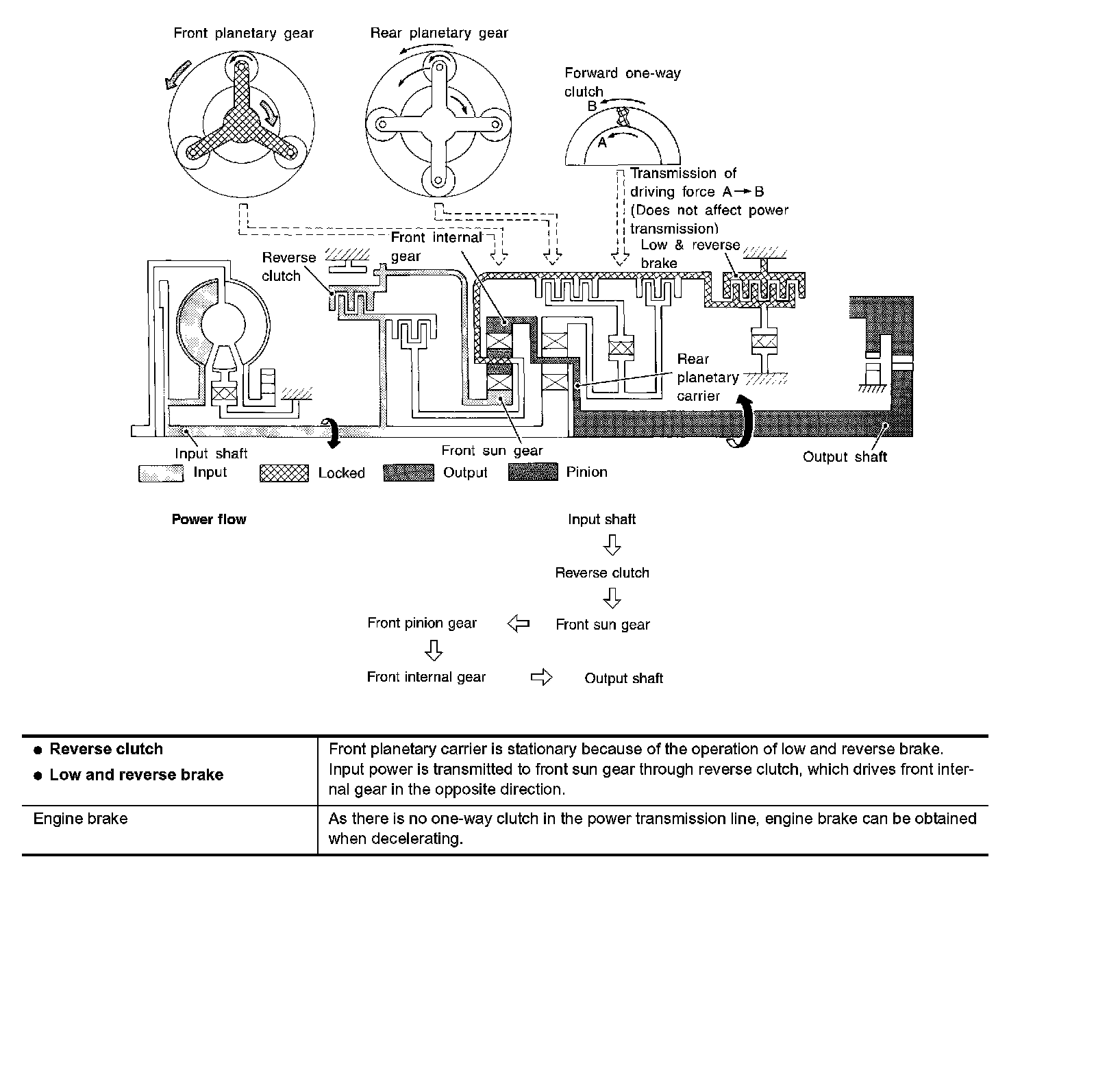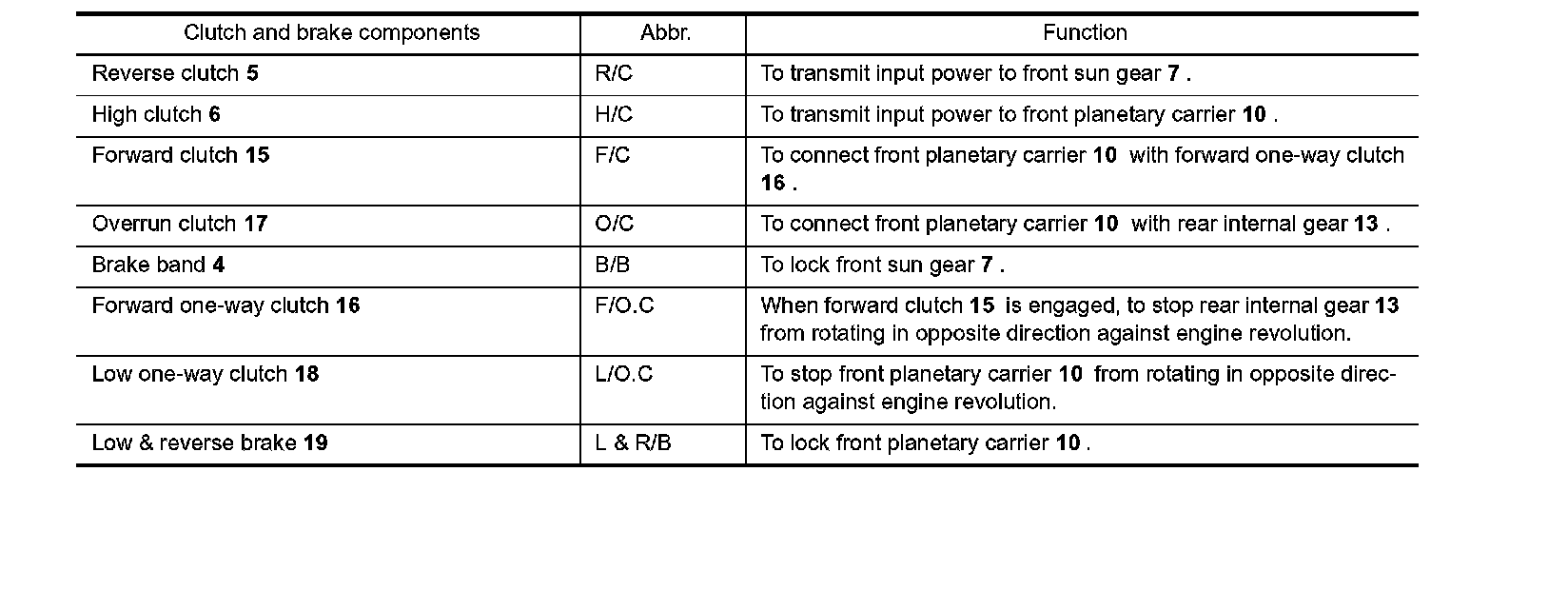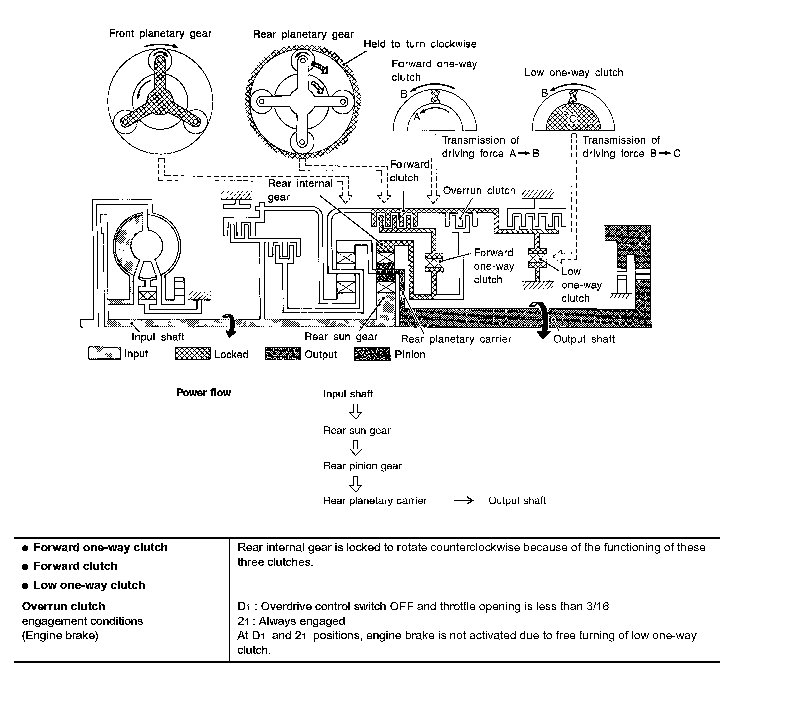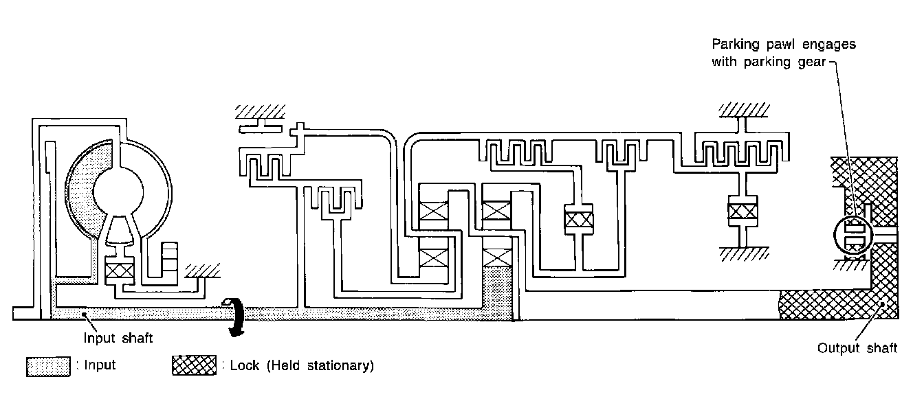 Similar to the N position, the clutches do not operate. The parking pawl engages with the parking gear to mechanically hold the output shaft so that the powertrain is locked.