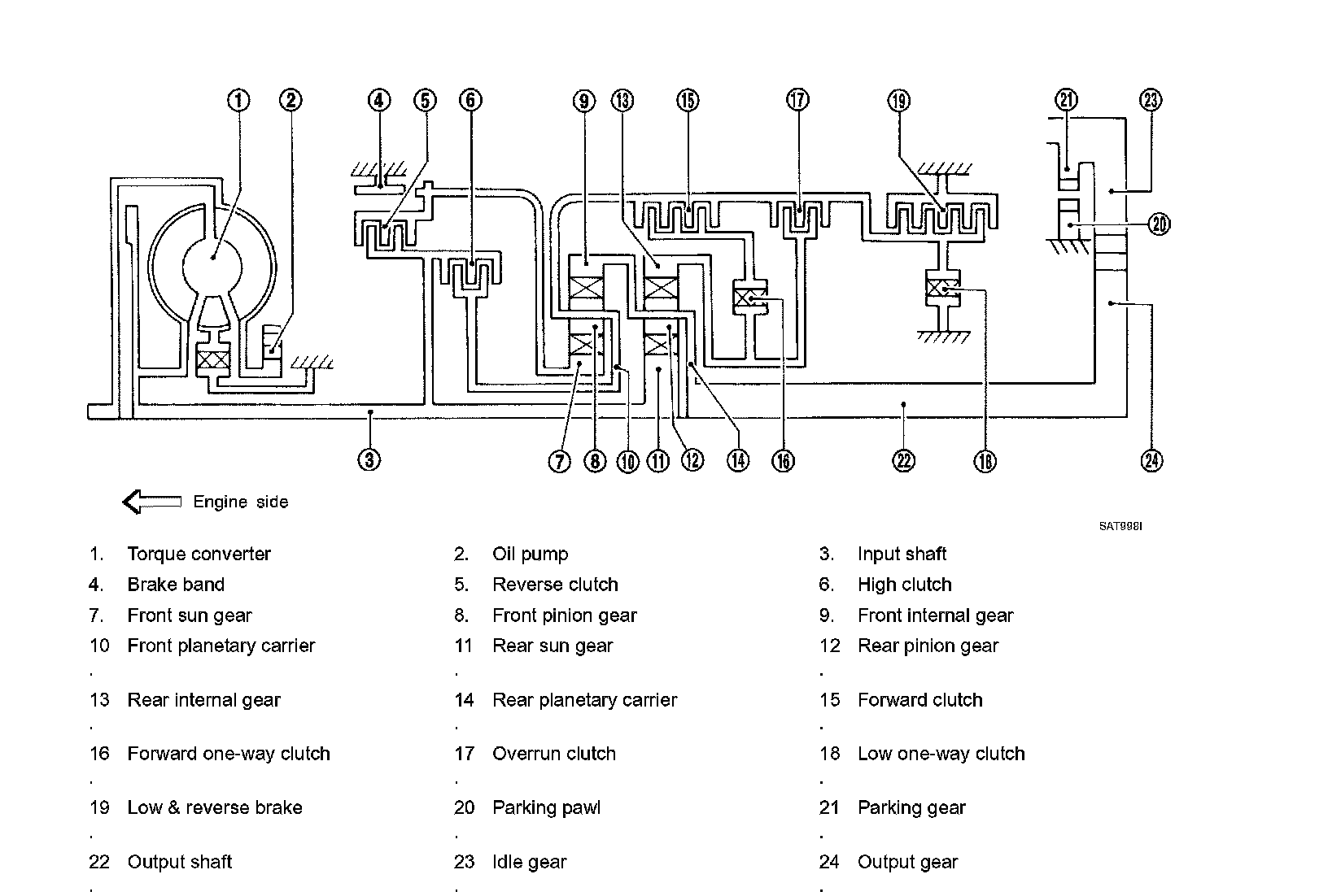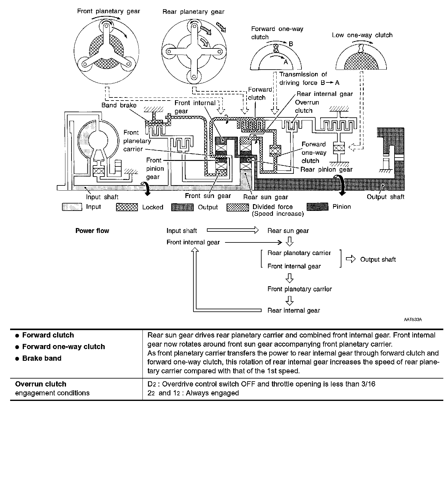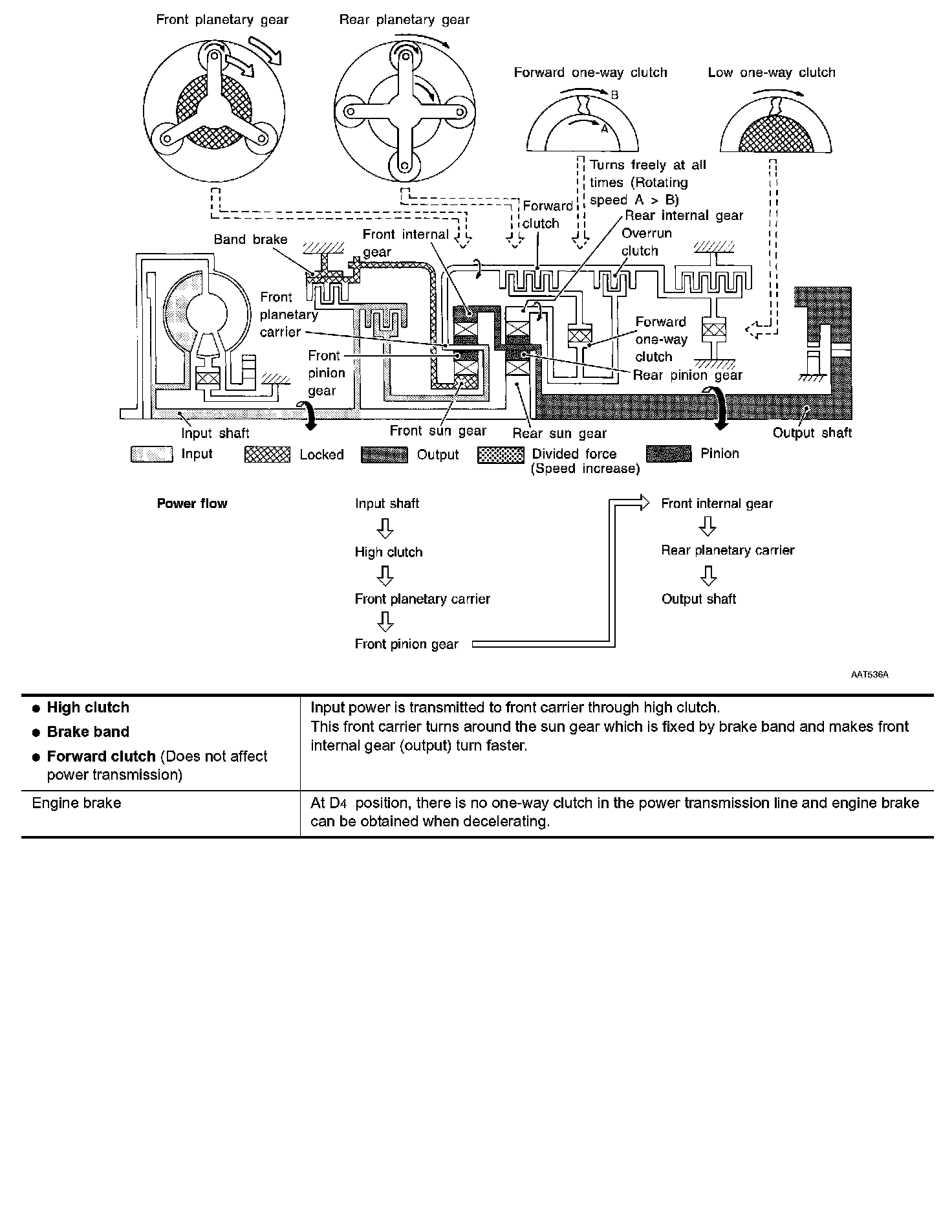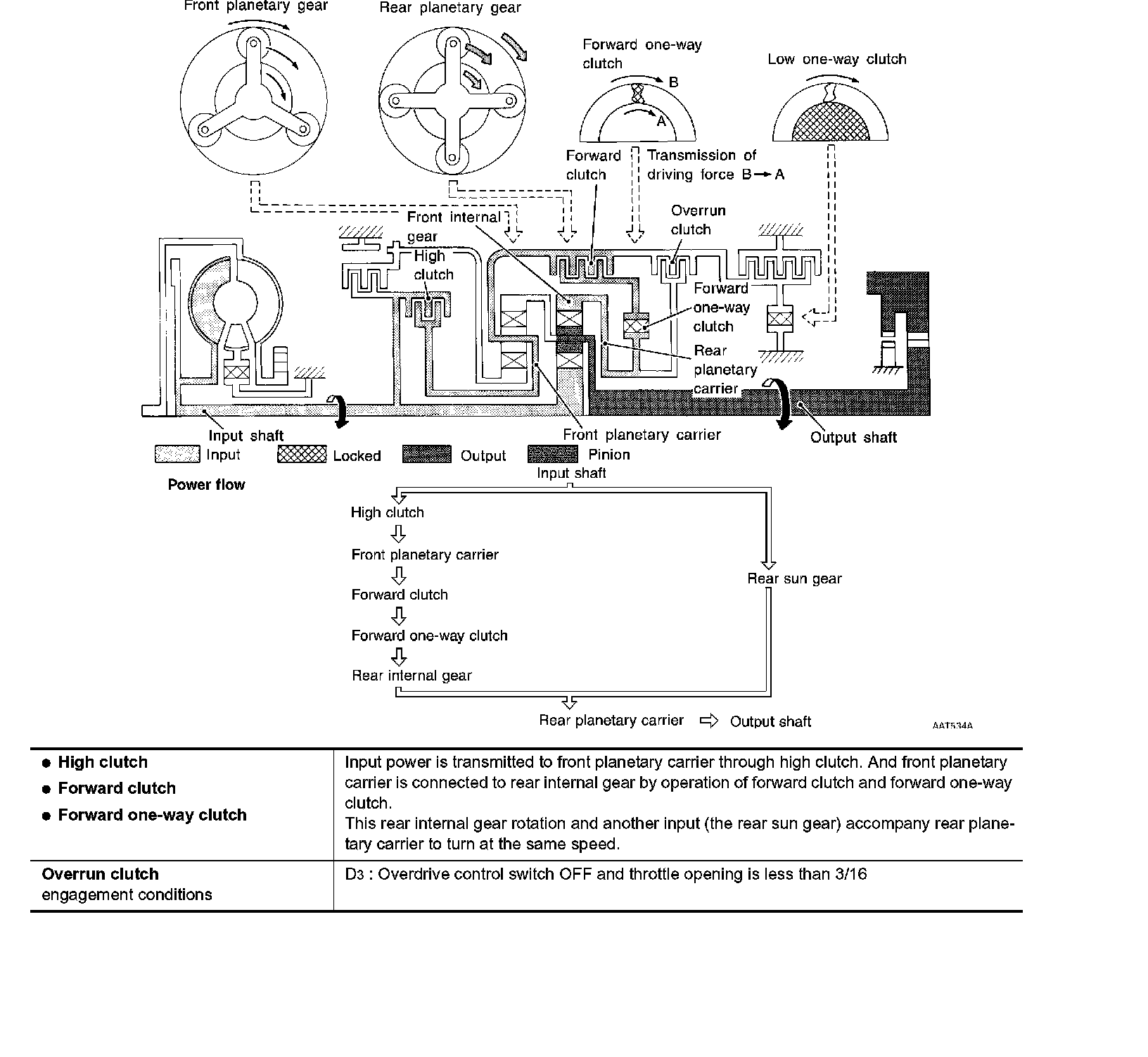Similar to the N position, the clutches do not operate. The parking pawl engages with the parking gear to mechanically hold the output shaft so that the powertrain is locked.