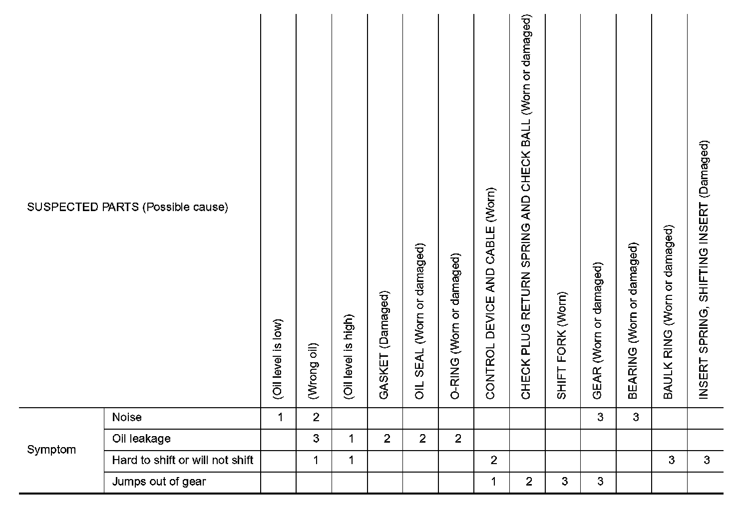 Use the chart below to help you find the cause of the symptom. The numbers indicate the order of the inspection. If necessary, repair or replace these parts.