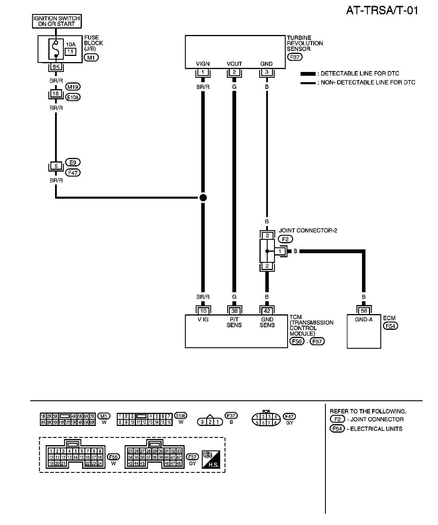 DescriptionThe turbine revolution sensor detects input shaft rpm (revolutions per minute). It is located on the input side of the automatic transaxle. The vehicle speed sensor A/T (Revolution sensor) is located on the output side of the automatic transaxle. With the two sensors, input and output shaft rpms are accurately detected. The result is optimal shift timing during deceleration and improved shifting.