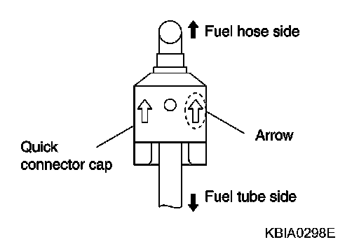 ^ Direct arrow mark on quick connector cap to upper side (fuel hose side).