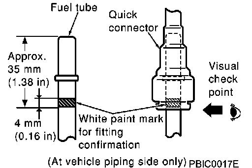 ^ Insert fuel tube into quick connector until the top spool on fuel tubes is inserted completely and the paint mark is positioned slightly below the quick connector bottom end.