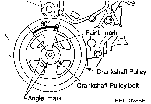 Crankshaft pulley bolt initial tightening: 37.3 - 47.1 Nm (3.8 - 4.8 kg-m, 28 - 34 ft. lbs.)