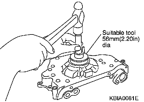 - Using a drift of 56 mm (2.20 inch) diameter, press oil seal in until it is flush with front end surface of front cover.