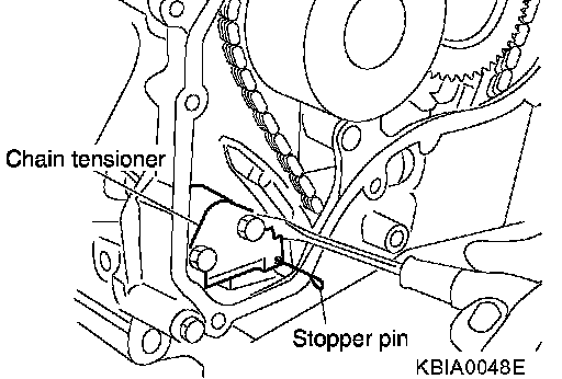 - After installing chain tensioner, remove stopper pin, and make sure the tensioner moves freely.