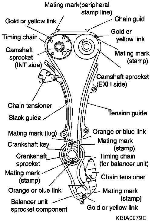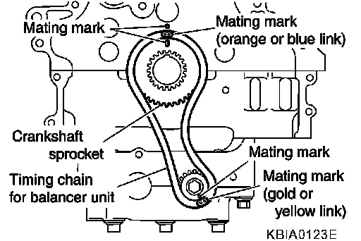 - Install by lining up mating marks on each sprocket and timing chain as shown.