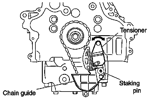 NOTE: Chain guide and tensioner move freely with the caulking pin as the axle. Therefore, bolt hole position of the three points could be changed during removal. If points change, temporarily fix the two mounting bolts on the chain guide and move the tensioner to match the bolt holes.