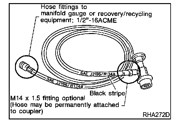 Be certain that the service hoses display the markings described (colored hose with black stripe). All hoses must include positive shut off devices (either manual or automatic) near the end of the hoses opposite the manifold gauge.