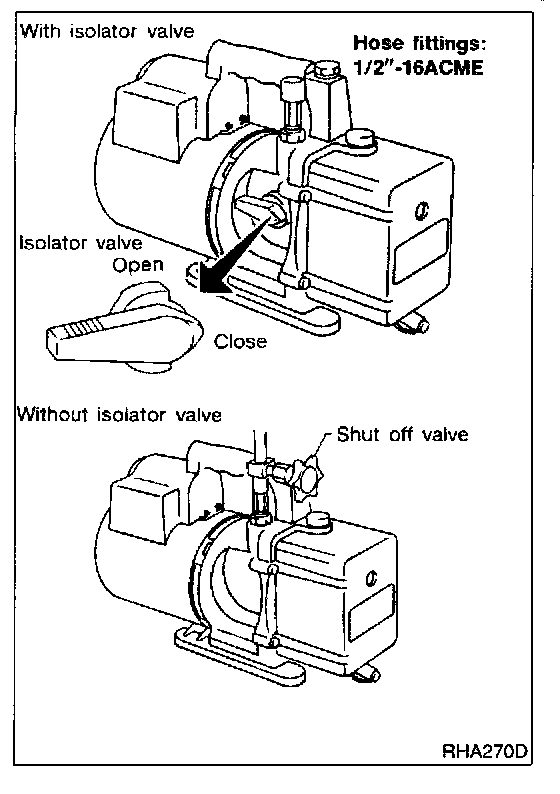 The lubricant contained inside the vacuum pump is not compatible with the specified lubricant for HFC-134a (R-134a) A/C systems. The vent side of the vacuum pump is exposed to atmospheric pressure. So the vacuum pump lubricant may migrate out of the pump into the service hose. This is possible when the pump is switched off after evacuation (vacuuming) and hose is connected to it.