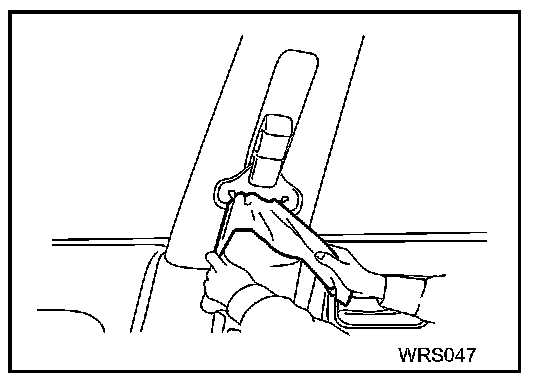 b. Allow the seat belt to retract. Ensure that belt returns smoothly and completely into the retractor. If the seat belt does not return smoothly, wipe the inside of the loops with a clean paper cloth etc. because dirt built up in the loops of the upper anchors can cause the seat belts to retract slowly.