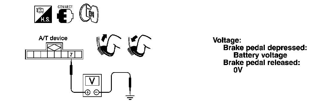 - Check voltage between A/T device harness terminal 7 and ground.