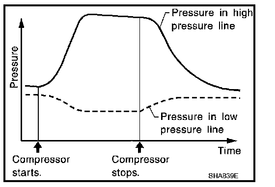 Refrigerant leaks should be checked immediately after stopping the engine. Begin with the leak detector at the compressor. The pressure on the high pressure side will gradually drop after refrigerant circulation stops and pressure on the low pressure side will gradually rise, as shown in the graph. Some leaks are more easily detected when pressure is high.