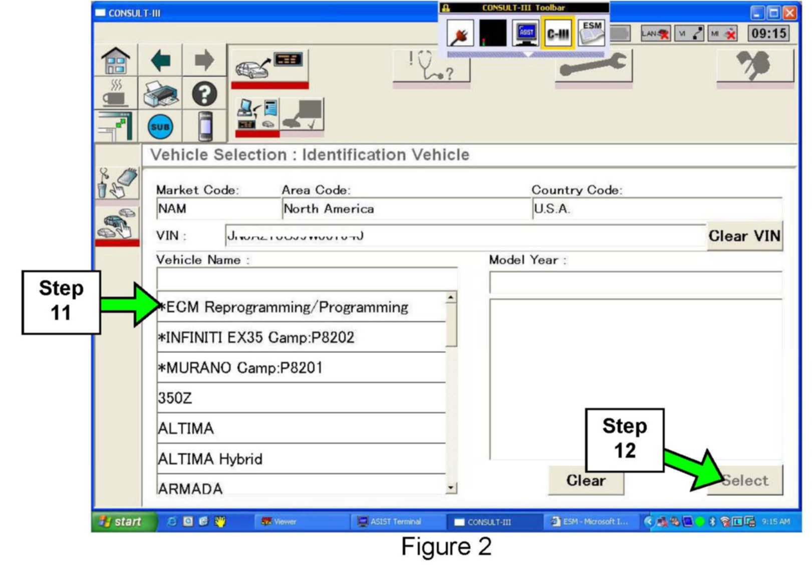 7. Select CONSULT Utilities, CONSULT-III, and Wait for the "Detecting VI/MI in progress" message to clear.