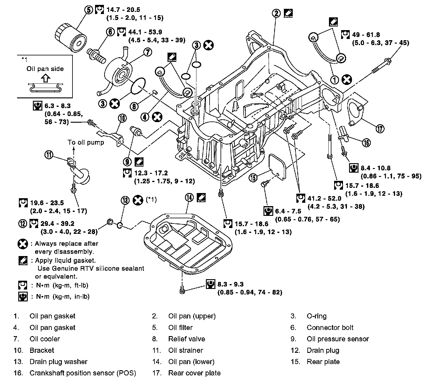 Oil pan (upper) 15.7 - 18.6 Nm (1.6- 1.9 kgf-cm, 12 - 13 ft. lbs.)