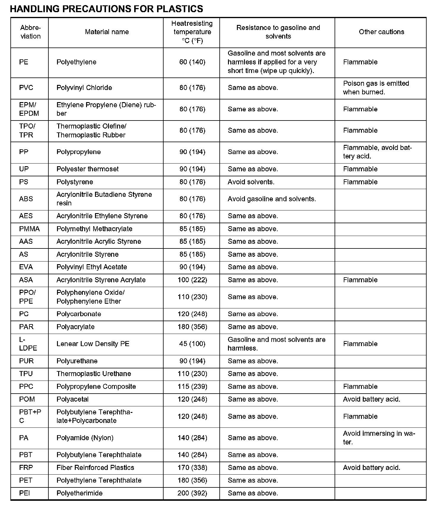 1. When repairing and painting a portion of the body adjacent to plastic parts, consider their characteristics (influence of heat and solvent) and remove them if necessary or take suitable measures to protect them.