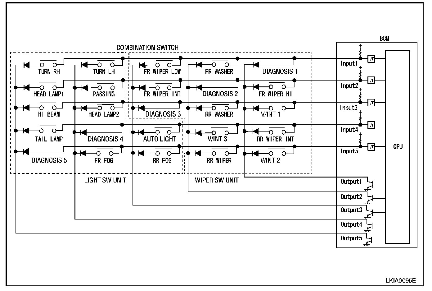 - BCM reads information of 20 switches and 5 diagnostic results by combining five output terminals (OUTPUT 1 - 5) and five input terminals (INPUT 1 - 5).