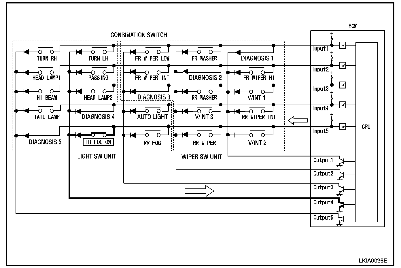 - When OUTPUT 4 transistor is ON, BCM detects current flow in INPUTS, and judges fog lamp switch is ON. Then BCM sends fog lamp ON signal to IPDM E/R using CAN communication.