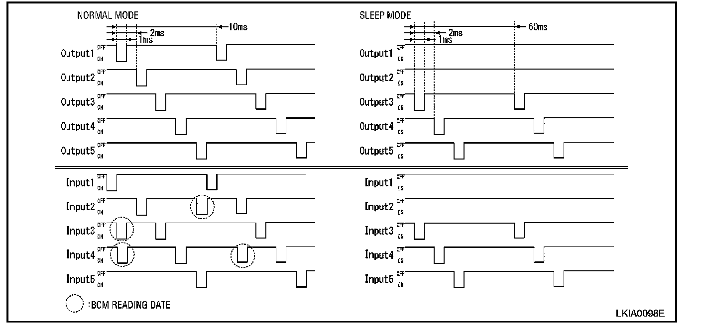 - When BCM is in sleep mode, transistors of OUTPUT 1 and 2 stop the output, and BCM enters low-current-consumption mode. OUTPUTS (3 - 5) turn ON-OFF at 60 ms intervals, and receives lighting switch input only.