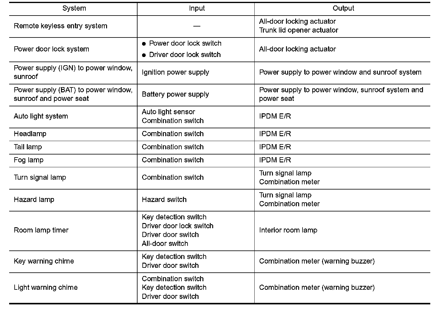 4. BCM - Operation table of combination switches