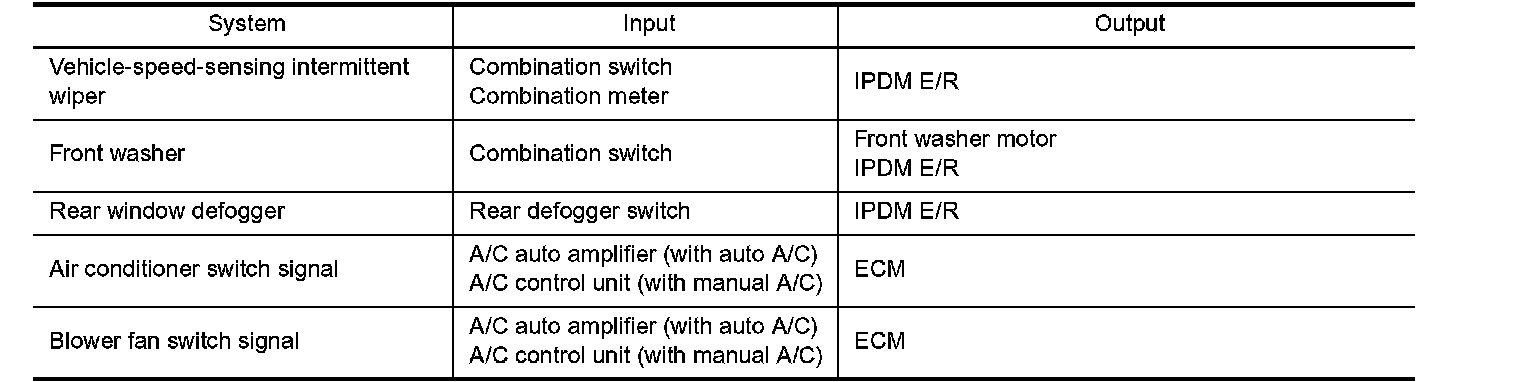 BCM has a combination switch reading function for reading the operation of combination switches (light, wiper washer, turn signal) in addition to the function for controlling the operation of various electrical components. Also, it functions as an interface that receives signals from the A/C control unit (with manual A/C), A/C auto amplifier (with auto A/C), and sends signals to ECM using CAN communication.