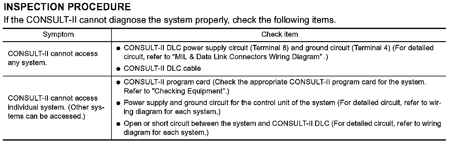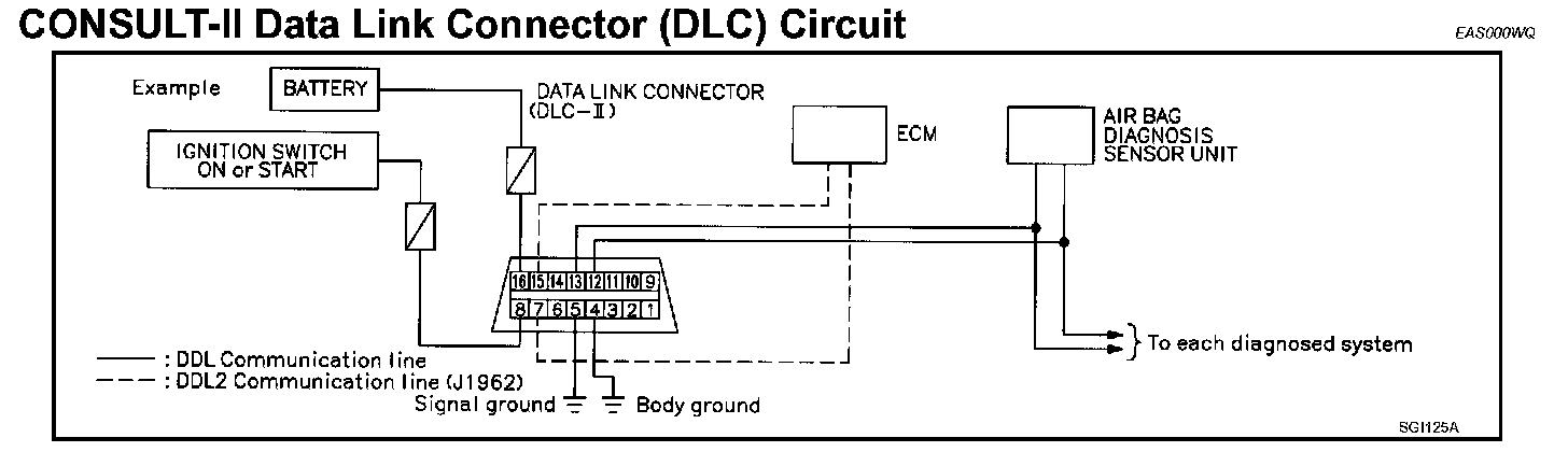 NOTE: The DDL1 and DDL2 circuits from DLC pins 12, 13,14 and 15 may be connected to more than one system. A short in a DDL circuit connected to a control unit in one system may affect CONSULT-II access to other systems.