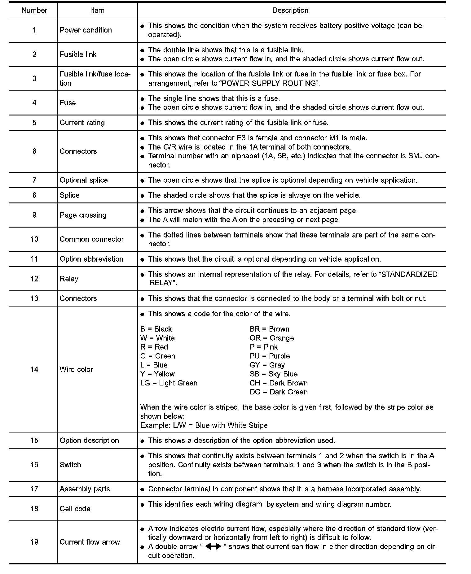 - Letter designations next to test meter probe indicate harness (connector) wire color.