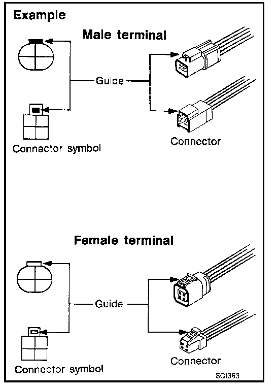 Connector guides for male terminals are shown in black and female terminals in white in wiring diagrams.