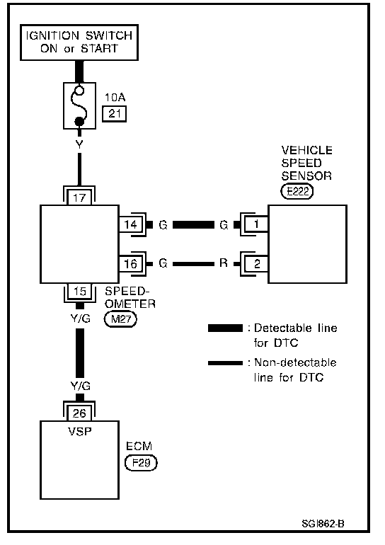 - A line with regular weight (wider line) represents a "detectable line for DTC (Diagnostic Trouble Code)". A "detectable line for DTC" is a circuit in which ECM can detect its malfunctions with the on board diagnostic system.