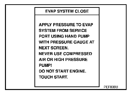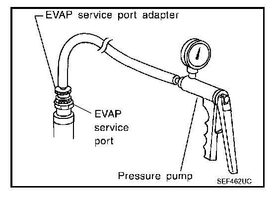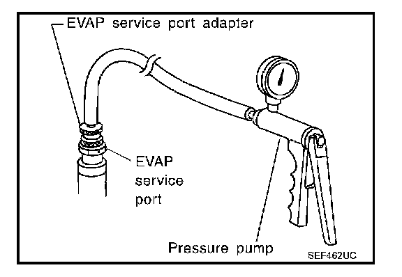 Positive pressure is delivered to the EVAP system through the EVAP service port. If fuel vapor leakage in the EVAP system occurs, use a leak detector to locate the leak.