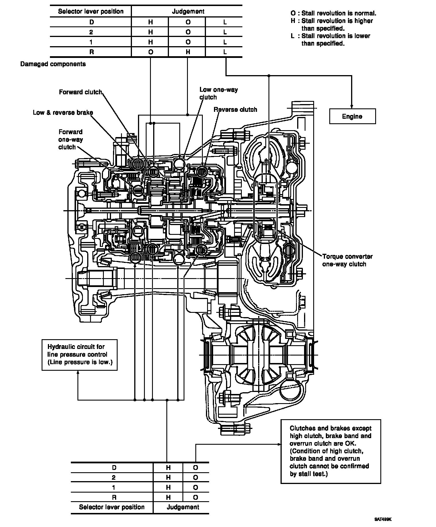 1st and 2nd gears in 2 position and engine brake functions with accelerator pedal released (fully closed throttle)...Forward clutch or forward one-way clutch slippage