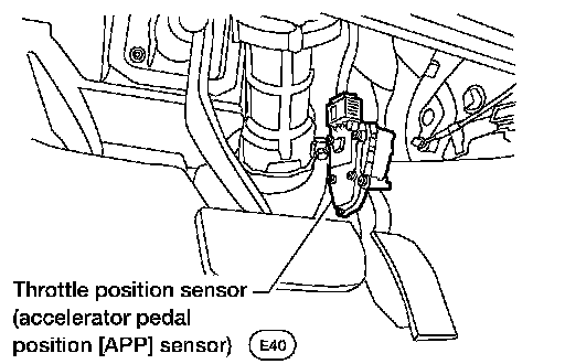 Check throttle position sensor [accelerator pedal position (APP) sensor]. Refer to "DTC P0122, P0123 TP SENSOR" and "DTC P2122, P2123 APP SENSOR" with QR25DE), or "DTC P0122, P0123 TP SENSOR" and "DTC P2122, P2123 APP SENSOR" with VQ35DE). P0122