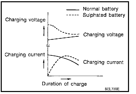 To determine if a battery has been "sulphated", note its voltage and current when charging it. As shown in the figure, less current and higher voltage are observed in the initial stage of charging sulphated batteries.