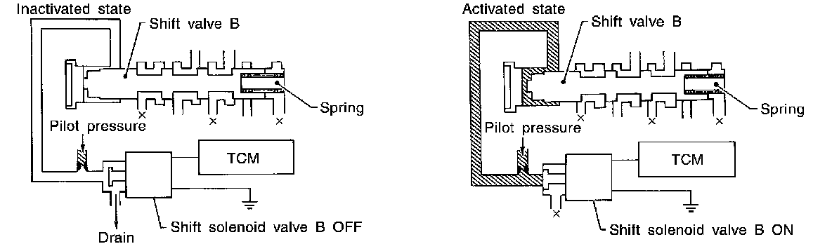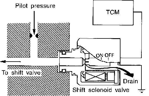 The shift solenoid valve performs simple ON-OFF operation. When set to "ON", the drain circuit closes and pilot pressure is applied to the shift valve.