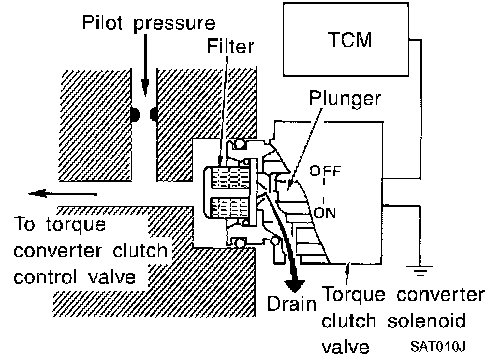 The torque converter clutch solenoid valve is controlled by the TCM. The plunger closes the drain circuit during the "OFF" period, and opens the circuit during the "ON" period. If the percentage of OFF time increases in one cycle, the pilot pressure drain time is reduced and pilot pressure remains high.