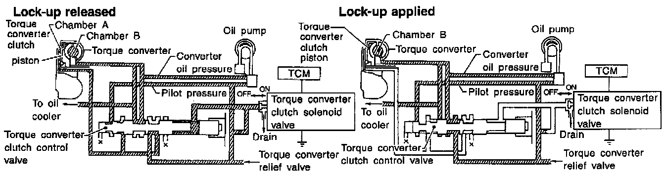 The OFF-duration of the torque converter clutch solenoid valve is long, and pilot pressure is high. The pilot pressure pushes the end face of the torque converter clutch control valve in combination with spring force to move the valve to the left. As a result, converter pressure is applied to chamber A (torque converter clutch piston release side). Accordingly, the torque converter clutch piston remains unlocked.
