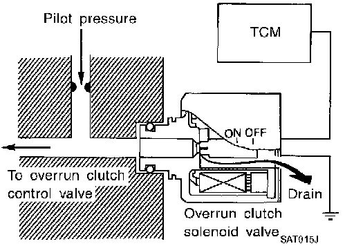 The overrun clutch solenoid valve is operated by an ON-OFF signal transmitted by the TCM to provide overrun clutch control (engine brake control).