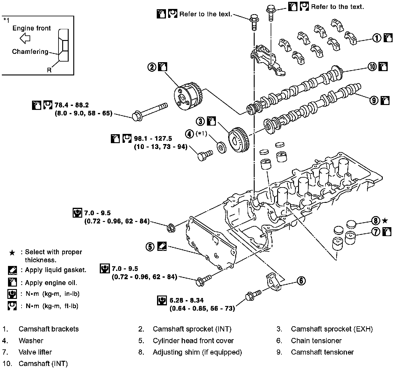 Intake camshaft: ..............78.4 - 88.2 Nm (8.0 - 9.0 kg-m, sprocket bolt 58 - 65 ft. lbs.)
