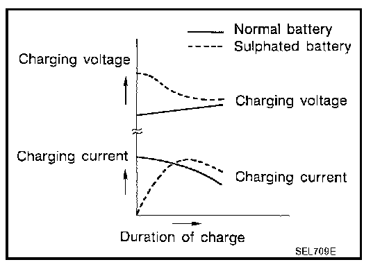 To determine if a battery has been "sulphated", note its voltage and current when charging it. As shown in the figure, less current and higher voltage are observed in the initial stage of charging sulphated batteries.