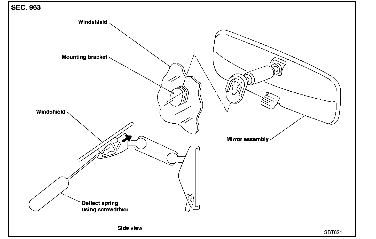Remove rear view mirror by pushing deflect spring with screwdriver as shown in the figure.