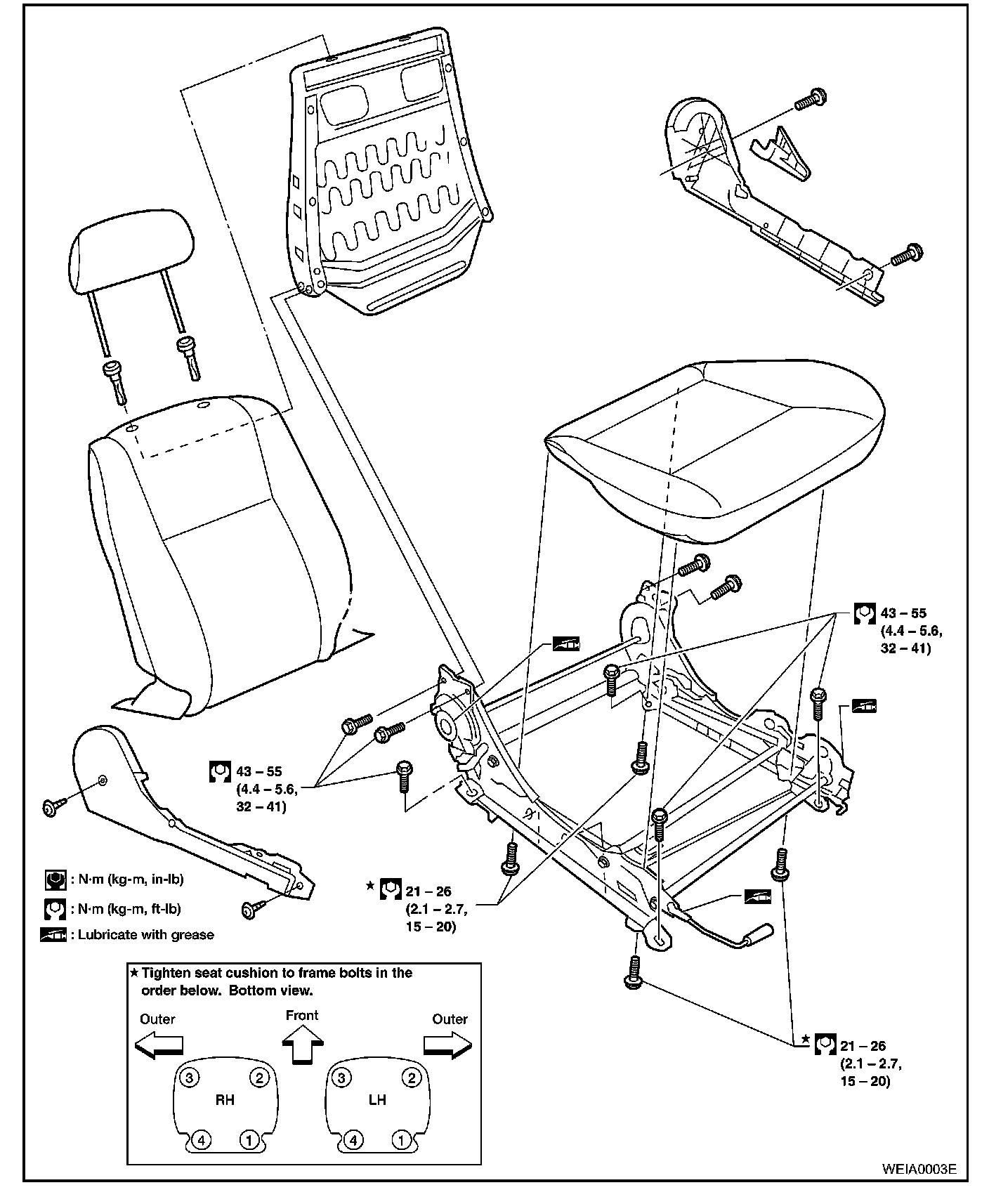 - On vehicles equipped with side air bags, before removing the front seat, turn the ignition switch off, disconnect the negative and positive battery cables and wait a minimum of 3 minutes.