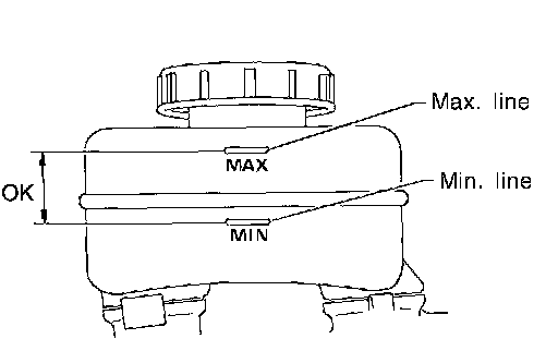 Checking Brake Fluid Level^ Check fluid level in reservoir tank. It should be between the "Max".and "Min" lines on reservoir tank.