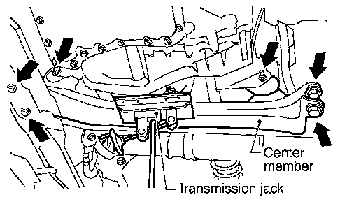 24. Remove the center member. Remove front and rear engine mounting insulator through-bolt and the center member bolts.