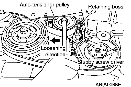 1. With box wrench, and while securely holding the hexagonal part in pulley center of drive belt auto-tensioner, move the wrench handle in the direction of arrow [loosening direction of tensioner].
