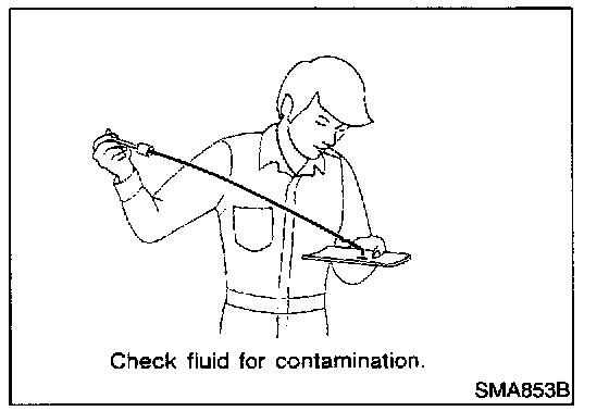 If fluid is very dark or smells burned, refer to "FLUID CONDITION CHECK". Flush cooling system after repair of A/T.