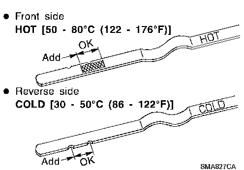 5. Re-check fluid level at fluid temperatures of 50 to 80°C (122 to 176°F) using "HOT". range on dipstick.