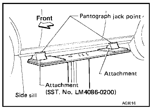 - The board-on lift attachment (LM4086-0200) set at front end of vehicle should be set on the front of the sill under the front door opening.