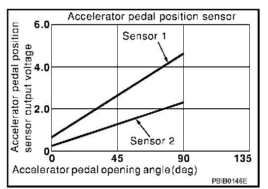 Accelerator pedal position sensor has two sensors. These sensors are a kind of potentiometers which transform the accelerator pedal position into output voltage, and emit the voltage signal to the ECM. In addition, these sensors detect the opening and closing speed of the accelerator pedal and feed the voltage signals to the ECM. The ECM judges the current opening angle of the accelerator pedal from these signals and controls the throttle control motor based on these signals.