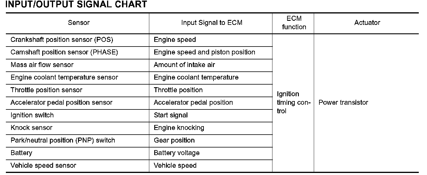 The ECM receives information such as the injection pulse width and camshaft position sensor signal. Computing this information, ignition signals are transmitted to the power transistor.