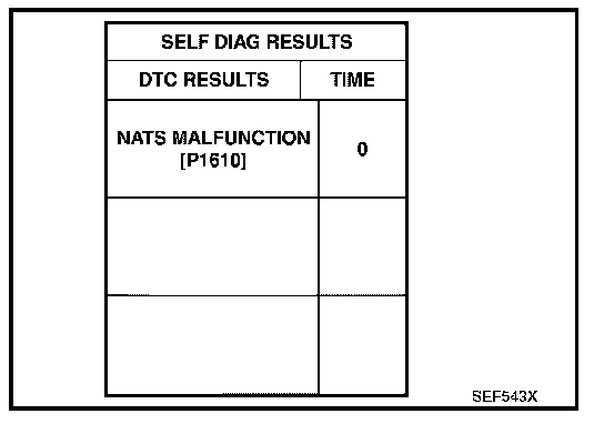 - If the security indicator lights up with the ignition switch in the "ON" position or "NATS MALFUNCTION" is displayed on "SELF-DIAG RESULTS" screen, perform self-diagnostic results mode with CONSULT-II using NATS program card. Refer to "NVIS (NISSAN VEHICLE IMMOBILIZER SYSTEM - NATS)". Antitheft and Alarm Systems
